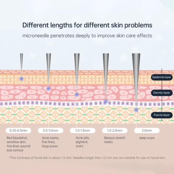 - Grâce aux paramètres de profondeur réglables, vous pouvez adapter l’appareil à vos besoins uniques en matière de soins de la peau. Adaptez le traitement à vos préoccupations spécifiques, pour une solution personnalisée et efficace.
