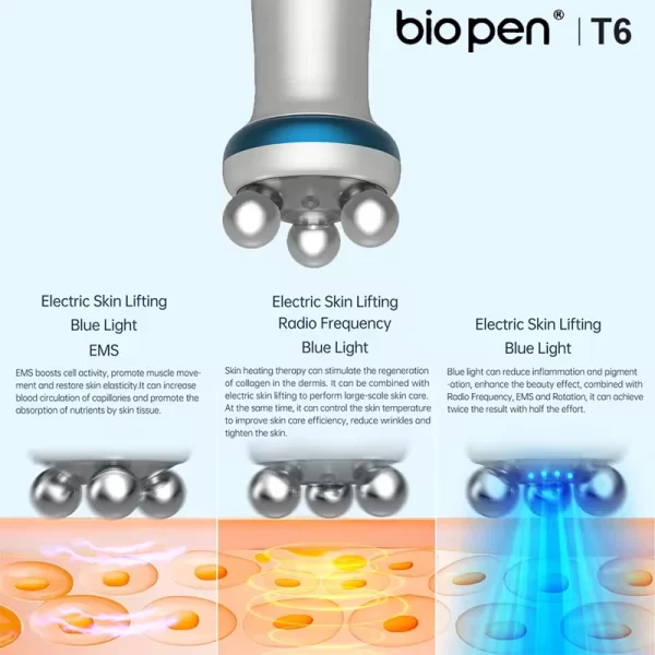 L’appareil Bio Pen T6 n’est pas seulement doté d’une puissante radiofréquence, mais aussi des dernières technologies de beauté, telles que la stimulation musculaire électrique (EMS) et la thérapie par la lumière bleue.
